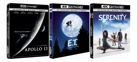 Ce mardi 5 décembre, Universal Pictures France sort 3 films en Blu-ray 4K Ultra HD et pas des moindres : Apollo 13 (film « spatial » incontournable de Ron Howard), E.T. L’extra-terrestre (le mythique film de Steven Spielberg) et Serenity (pour les fans de Firefly). Chaque film est proposé en boite avec Blu-ray 4K UHD, Blu-ray standar et copie digitale ainsi que de nombreux bonus. Concernant E.T. on note une piste audio française en DTS High Resolution 7.1.