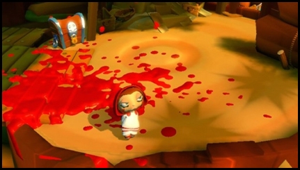 Facile à manier, le jeu se présente dans une sorte de scrolling à travers des environnements 3D. On profite donc d’une profondeur de champs pour opérer et la caméra nous suit assez bien. Pour le combat, le système est simple et efficace, on prend vite plaisir à enchainer les combos. Il faudra néanmoins bien orienter son personnage pour attaquer le bon ennemi. On aurait pu souhaiter plus de précision à ce niveau là mais globalement ça tient la route. Le concept est donc original, drôle et facile à prendre en main. Cependant on constate vite ses limites et finalement on trouve peu de renouvellement au niveau du gameplay et des armes. Dommage. Sans être au top, la réalisation est plutôt bonne avec des couleurs chatoyantes, des détails dans les décors et une modélisation honnête. Bien sûr, il faut adhérer au style mais je trouve que celui-ci provoque un bon décalage avec le côté sanglant.