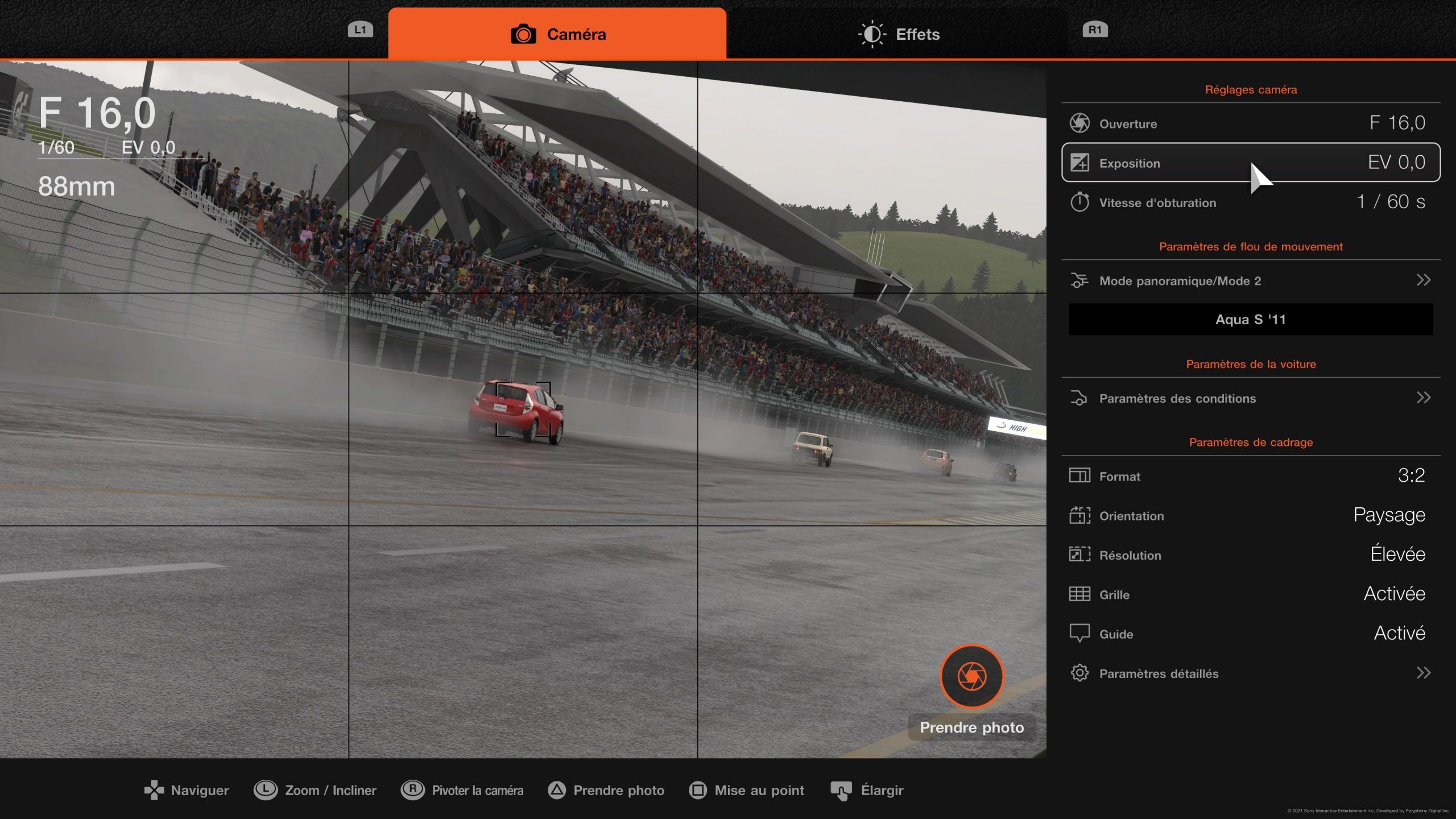 On pourra par exemple, dans la zone GT Auto, se contenter de changer la couleur de sa voiture, de lui attribuer de nouveaux éléments cosmétiques et même customiser notre pilote jusqu’au casque et la possibilité de coller tout un tas de tickets déjà dispos ou bien d’en créer soi-même avec un logiciel intégré diablement complet. Car qui dit Gran Turismo dit esthétique. Et ici, sur PS5, on est servi et quoi de mieux que de mettre en scène sa voiture préférée dans le modes Scapes qui propose pas moins de 2500 endroits du globe afin de réaliser des clichés ultra-réaliste. Le mode photo inclus est très complet et permet de jouer sur la profondeur de champs, de jouer sur les couleurs, d’appliquer des filtres. On peut même ajouter un pilote à côté dans diverses positions ou même ajouter un autre véhicule pour des clichés toujours incroyables. C’est d’ailleurs ici qu’on profite le plus de la qualité graphique du titre notamment sur les véhicules. Leur modélisation est incroyable et on note que le Ray Tracing apporte un joli plus dans tout ce qui est reflet sur les carrosseries.