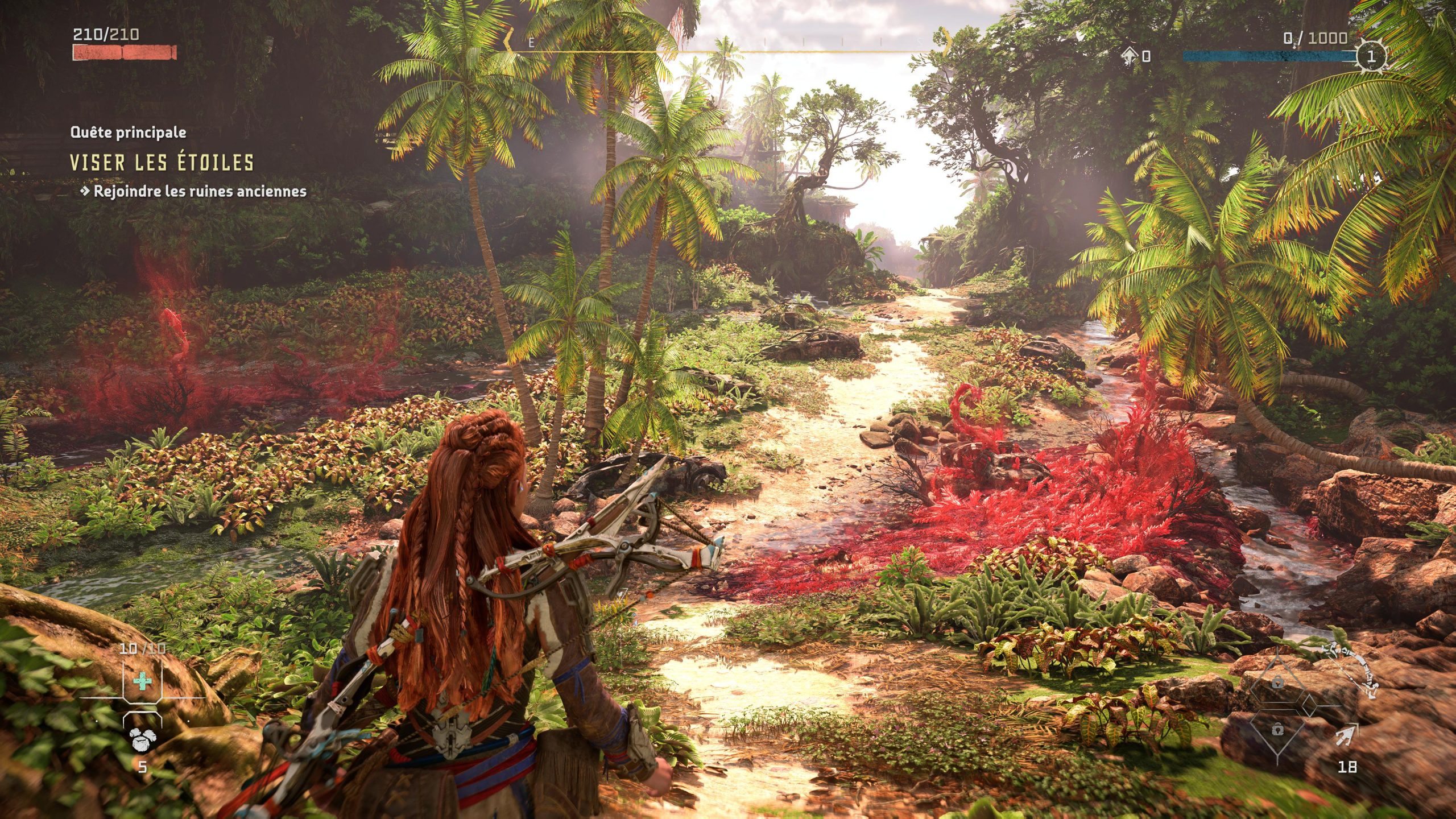 Horizon Forbidden West reste un jeu où l’exploration prime et on reprend ses marques avec un concept qu’on connait du premier épisode à la différence près qu’on peut maintenant user d’un grappin bien pratique et différentes possibilité d’action comme le gel d’éléments, la destruction de murs, etc… Tout s’intègre à un gameplay existant qui souffre parfois je trouve de quelques imprécisions encore (caméra lors des combats, justesse dans les sauts lors des phases de plate-forme…). On ne toujours pas grimper partout non plus mais à ce niveau c’est également amélioré avec quand même davantage de possibilités d’accroches. On trouve aussi parmi les nouveautés, la possibilité d’utiliser une paravoile (comme Link!…) ce qui permet des actions aériennes toujours agréables et pratiques.