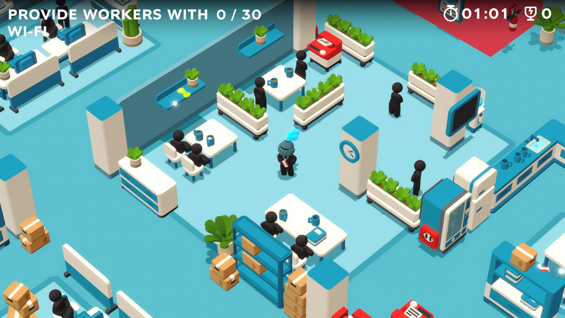 Dans un look très épuré et coloré, en 3D isométrique avec des personnages « silhouettes », on s’amuse très vite à déambuler dans les pièces surtout quand on se rend compte qu’il est très facile de faire des dégâts… buter dans des cartons, bousculer les employés, casser des vitres… Si nos missions ne demandent justement pas de casser quoique ce soit, on prend un malin plaisir en cassant tout en s’aidant de câbles électriques pour jouer à la catapulte ou bien déplacer des employés imperturbables toujours vissés sur leur siège de bureau…