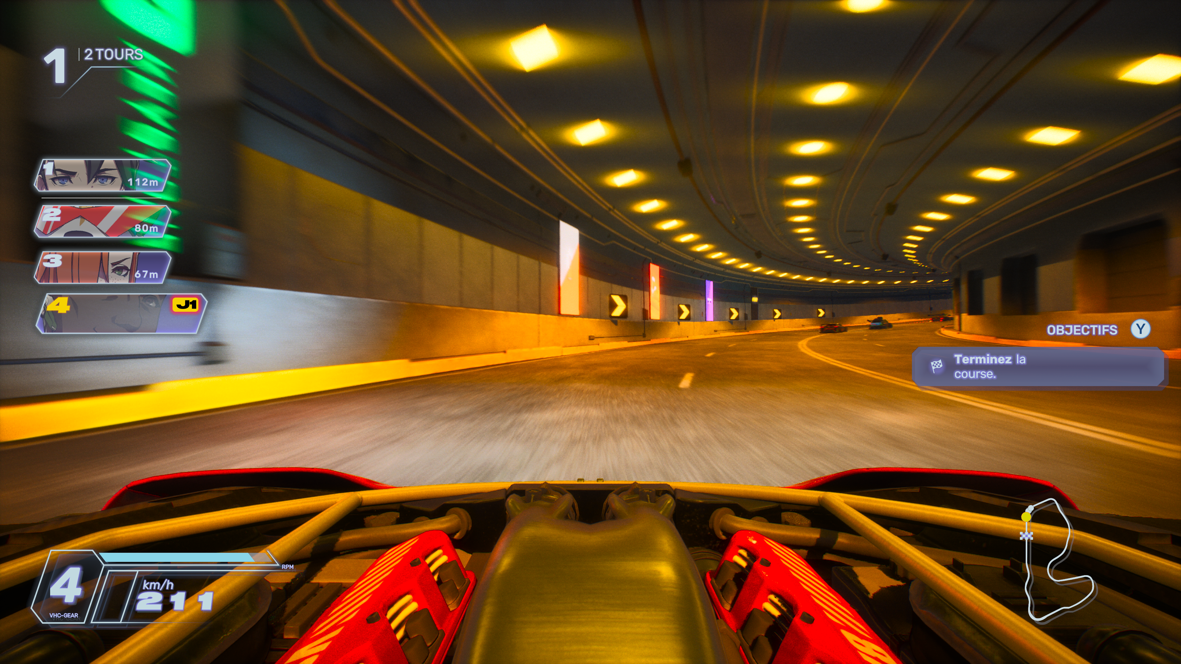 Très scénarisé, le jeu nous met dans la peau d’un pilote parmi d’autres, de différentes nationalités (d’ailleurs, chacun parle dans sa propre langue, c’est amusant). Les courses qui s’enchainent, souvent de nuit, dans un univers futuriste, son donc plutôt exigeante et axé sur un système de jauge assez novateur.
