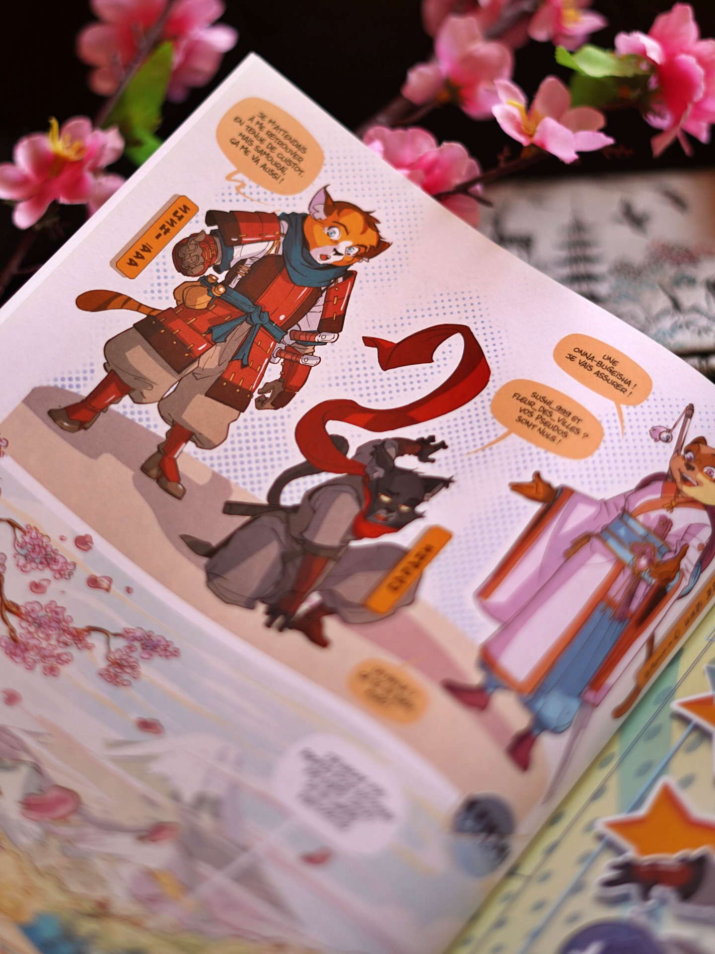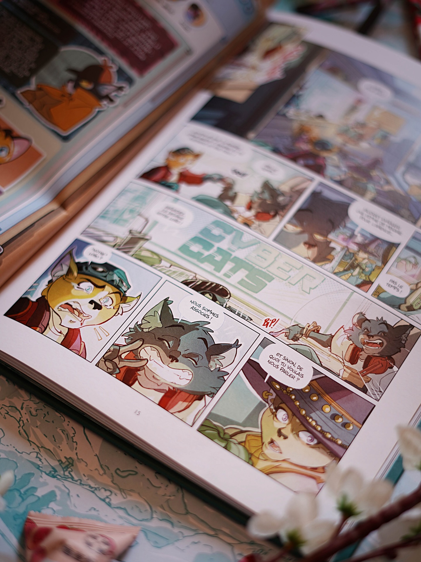 Voilà le décor planté. Nos héros, les Cybercats, sont des chats qui, dans ce futur imaginaire, sont quasi humanisés et vivent parmi les humains dans une ville futuriste très connectée. Entre Ready Player One et les Entrechats, on vit une aventure entre cette réalité et l’univers virtuel du jeu vidéo Kensei. Tous les codes du jeu vidéo sont là avec des clins d’oeil amusants.