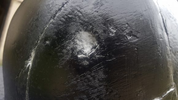 Une fois le casque sec, j’applique, avec un vieux pinceau brosse, de la peinture grise métallisée (peinture à maquette), sur les zones saillantes et les coups du casque pour marquer l’usure.