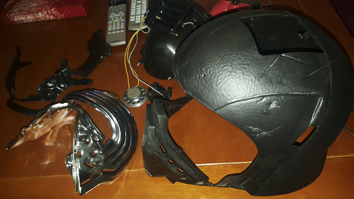 Voici donc le casque utilisé. Très proche de celui du film, il embarque un modificateur de voix très peu performant malheureusement. Je l’ai donc complètement enlevé et ensuite, le but était dans un premier temps de coller la partie avant du casque à la partie arrière et combler les écarts visibles (dont celui du compartiment à piles sur le dessus).