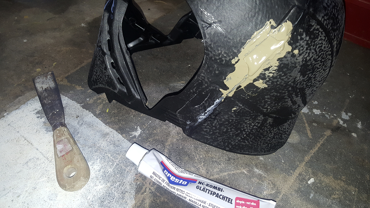 Très vite, je me suis rendu compte que le Presto avait tendance à craqueler au séchage. Du coup, j’ai entrepris de repasser une couche avec du Sintofer, plus costaud et plus résistant. Mais aussi plus difficile à poncer… J’en profite d’ailleurs, avec une petite meuleuse, pour accentuer les coups de sabre-laser sur le casque…