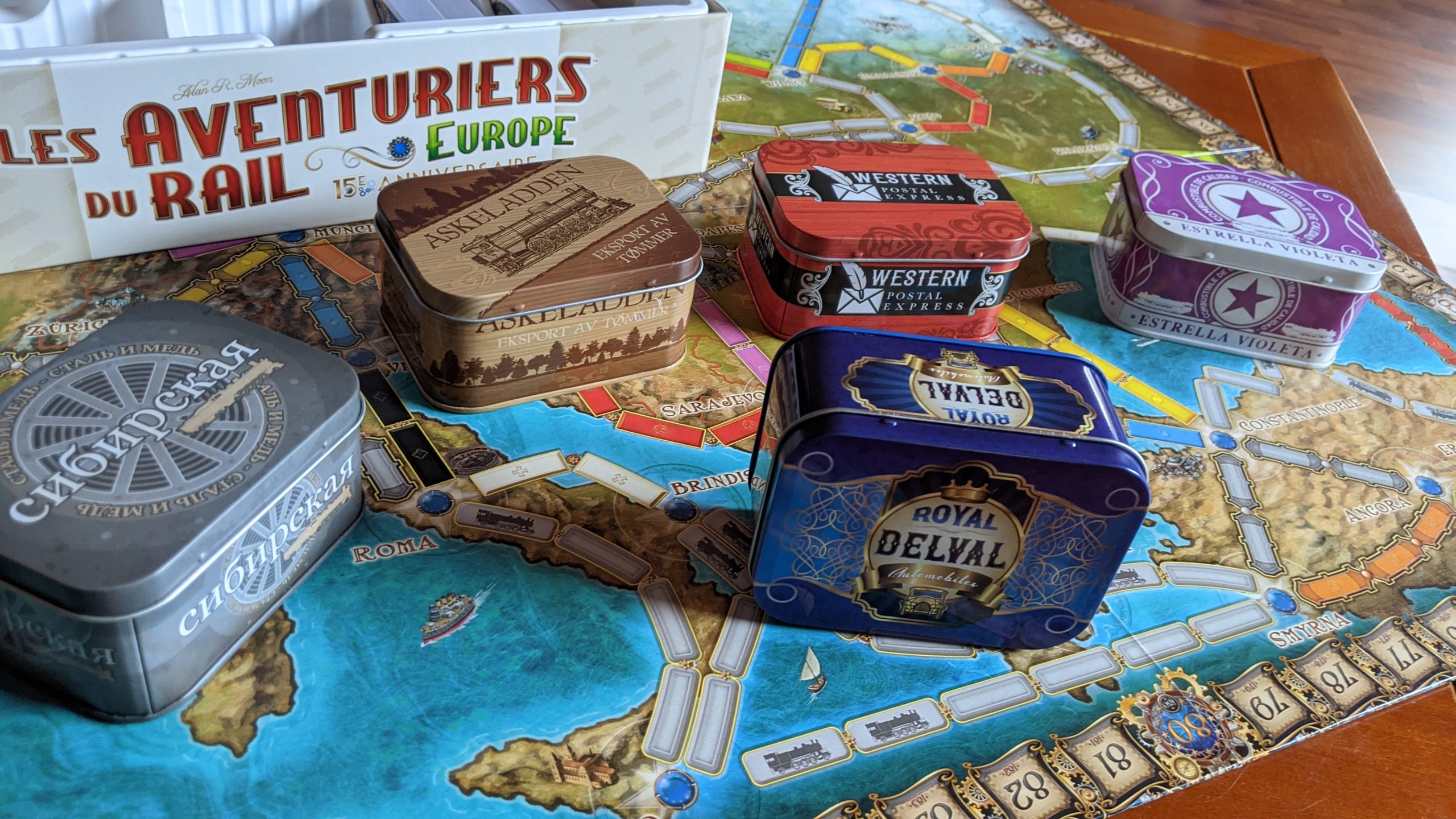 Je ne reviendrais pas sur les règles du jeu que vous connaissez sans doute (pour faire bref il s’agit de relier des villes d’Europe avec des trains!). Penchons-nous aujourd’hui sur l’objet, ce collector sublime qui contient un plateau (très) grand superbement illustré, 5 magnifiques boites métalliques contenant les différents wagons pour chaque joueur. Les couleurs sont différentes mais l’apparence également : wagon chargé d’une voiture, de bois, d’une citerne, etc.. On y trouve aussi les fameuses gares qui permettent de profiter d’un trajet créé par un autre joueur. Les marqueurs de score sont eux aussi différents. On trouve aussi, bien sûr, les cartes destination (toutes les cartes sorties à ce jour!) et les cartes wagons aux couleurs des 15 ans. Tout cela est très joli.