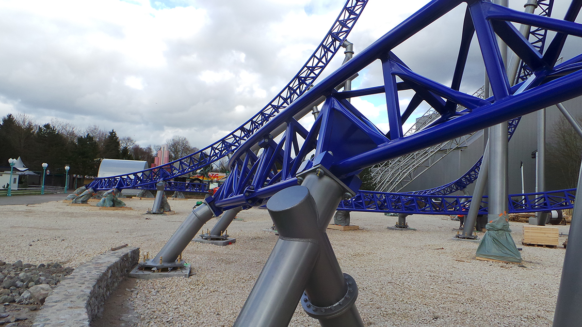Mais revenons à l’actualité avec Alpina Blitz ce magnifique coaster (montagne russe si vous préférez…) flambant neuf. En effet, l’attraction est terminée et les rails posés. Reste à terminer le décors (alpin Suisse…) ainsi que la gare (un chalet de 12 m de haut) qui accueillera les courageux visiteurs. Dans un mois, l’attraction pourra être testée et dans 2 mois, le 12 avril donc, ouverte au public. Les chiffres font froid dans le dos (ou excite plutôt la curiosité) : 100 km/h, 4G d’accélération, 70m de chute, 9 airtimes et une montée qui culmine à 33 mètres de haut! Le gros moteur d’Alpina Blitz hisse le train jusqu’à ce point culminant au début du circuit. Ensuite, c’est le simple poids du bolide qui engrange la vitesse jusqu’à l’arrivée. Notez que même si l’attraction propose des virages serrés, des bosses plutôt hautes et des passages pour le moins « penchés », elle ne comporte pas de looping. Ainsi, ce coaster, s’il reste certainement impressionnant de vitesse et généreux en émotion, pourra être tenté par le plus grand nombre de visiteurs.